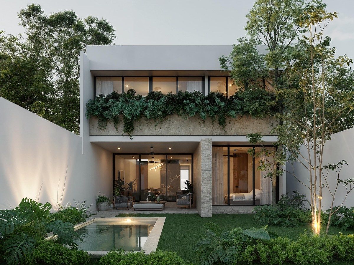 Equipamiento incluido: Barandales de vidrio templado, gavetas de encino en cocina, closets de madera en recámaras, fijos de vidrio templado en baños, espejos en baños, tanque estacionario, calentador y césped en jardín trasero, alberca iluminada con acabado chukum blanco y piedra decorativa en algunos muros.