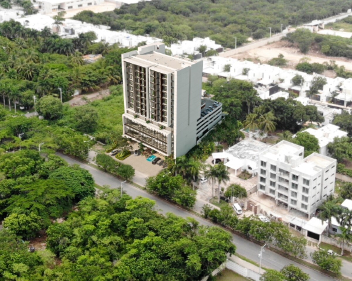 Este desarrollo vertical de 14 niveles alberga 65 departamentos de 1 y 2 habitaciones, junto con áreas de oficinas y un espacio comercial en planta baja. Su arquitectura moderna, combinada con elementos naturales, crea un ambiente sofisticado y equilibrado, mientras que sus espacios comunes invitan a relajarse, convivir y trabajar, elevando la experiencia diaria de sus residentes.
